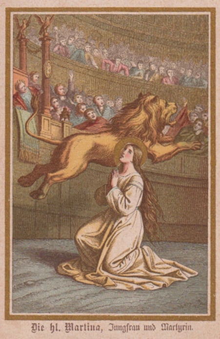 In wildem Unmut befahl Severus, sie ins Amphitheater zu führen und den Löwen vorzuwerfen; er selbst wollte dabei zuschauen. Marina kniete in entzückender Schönheit auf dem Sand und betete; der hungrige Löwe stürzte brüllend aus dem Zwinger und legte sich, von unsichtbarer Macht gezähmt, schmeichelnd zu ihren Füßen; dann erhob er sich, flog in rasendem Sprung über die hohen Schranken und tötete viele Zuschauer. Der erboste Kaiser schrieb dieses Wunder der Zauberei Martinas zu und glaubte entdeckt zu haben, dass diese Zauberkraft in ihren Haaren liege. Sogleich befahl er, ihr Haupt kahl zu scheren und sie in den Tempel des Jupiters, in welchem noch zwölf andere Götter verehrt wurden, einzusperren. An den folgenden zwei Tagen ging Severus mit Priestern und dem Volk zum Tempel, aber er trat nicht hinein, weil man viele Männerstimmen darin hörte und meinte, Jupiter habe seine Götter versammelt, um Martina zu bekehren. Erst am dritten Tag wurde der Tempel geöffnet zum festlichen Opfer; aber – alle Götzenbilder lagen zertrümmert am Boden. Entrüstet fragte der Kaiser, wo Jupiter sei? Martina sprach lächelnd: „Er hat Christus, meinem Herrn, Rechenschaft geben müssen, dass er die zwölf Götzen hier nicht vom Untergang gerettet; und zur Strafe hat ihn mein Gott den Teufeln übergeben, welche ihn dann zerrissen.“ Über diesen Spott rasend befahl der Kaiser, sie mit heißem Fett zu übergießen und im Feuer zu verbrennen. Aber ein furchtbarer Regenschauer löschte plötzlich die Flammen. Auf dieses neue Wunder folgte endlich das Todesurteil durch das Schwert.“